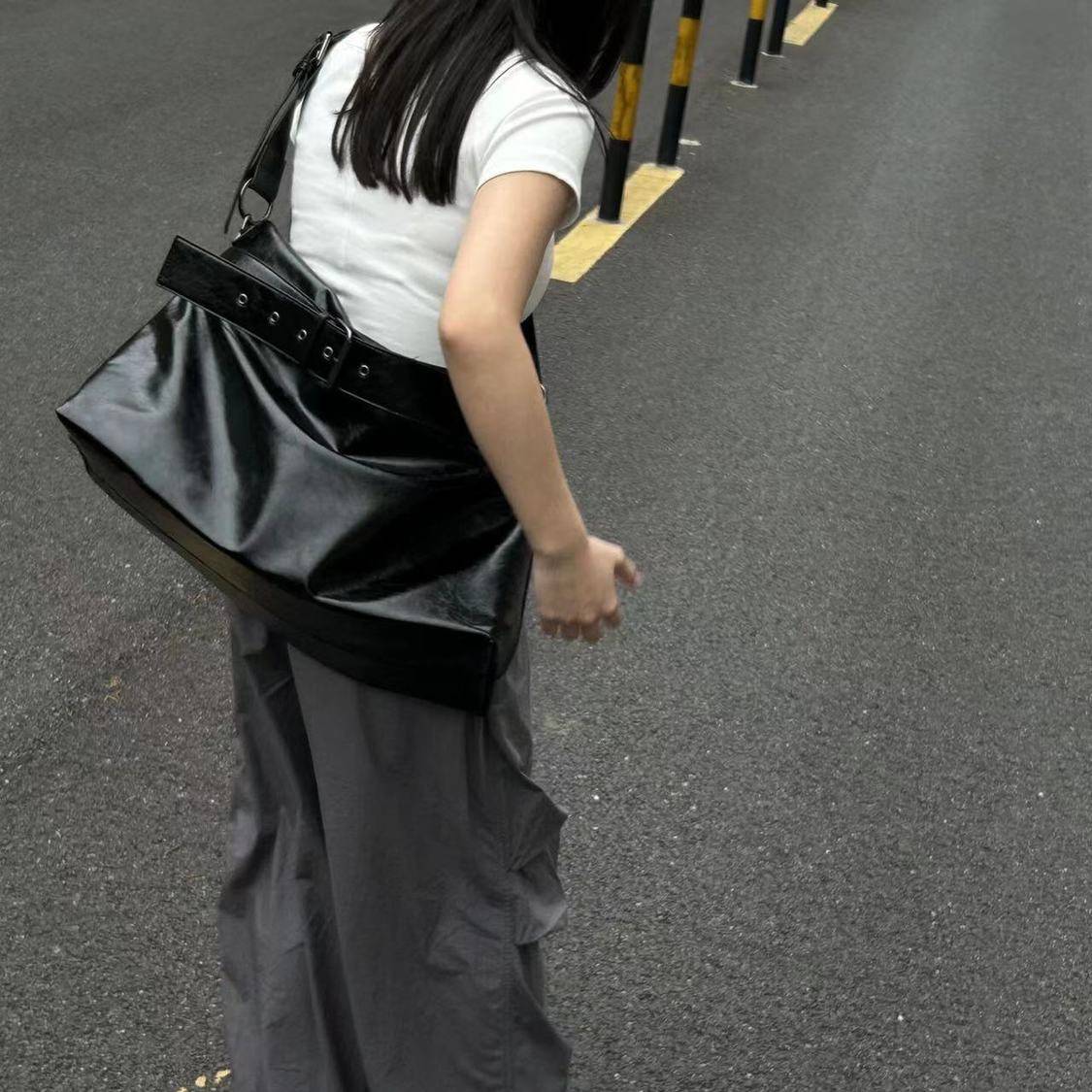 ベルトデザイン ショルダーバッグ 大容量 バッグ 黒 ワンショルダー トート 肩掛け モード系 ストリートコーデ 韓国ファッション 海外トレンド 大人女子 通勤通学 A4収納 ブラック K-B0196