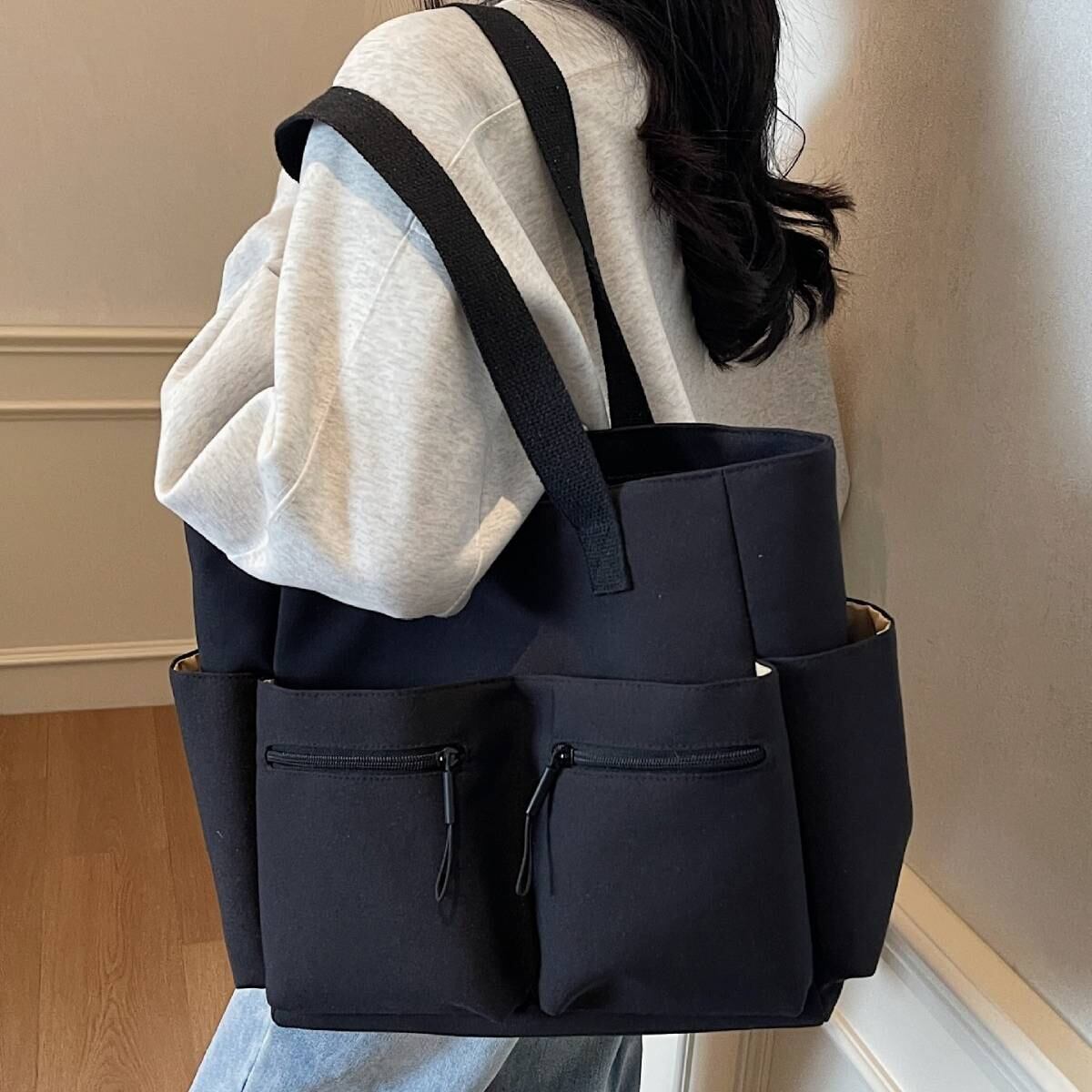 ブラック トートバッグ キャンバス 大容量 ポケット付き カジュアルバッグ 韓国風バッグ マザーズバッグ 学生バッグ 通学 通勤 人気 3色展開 K-B0222