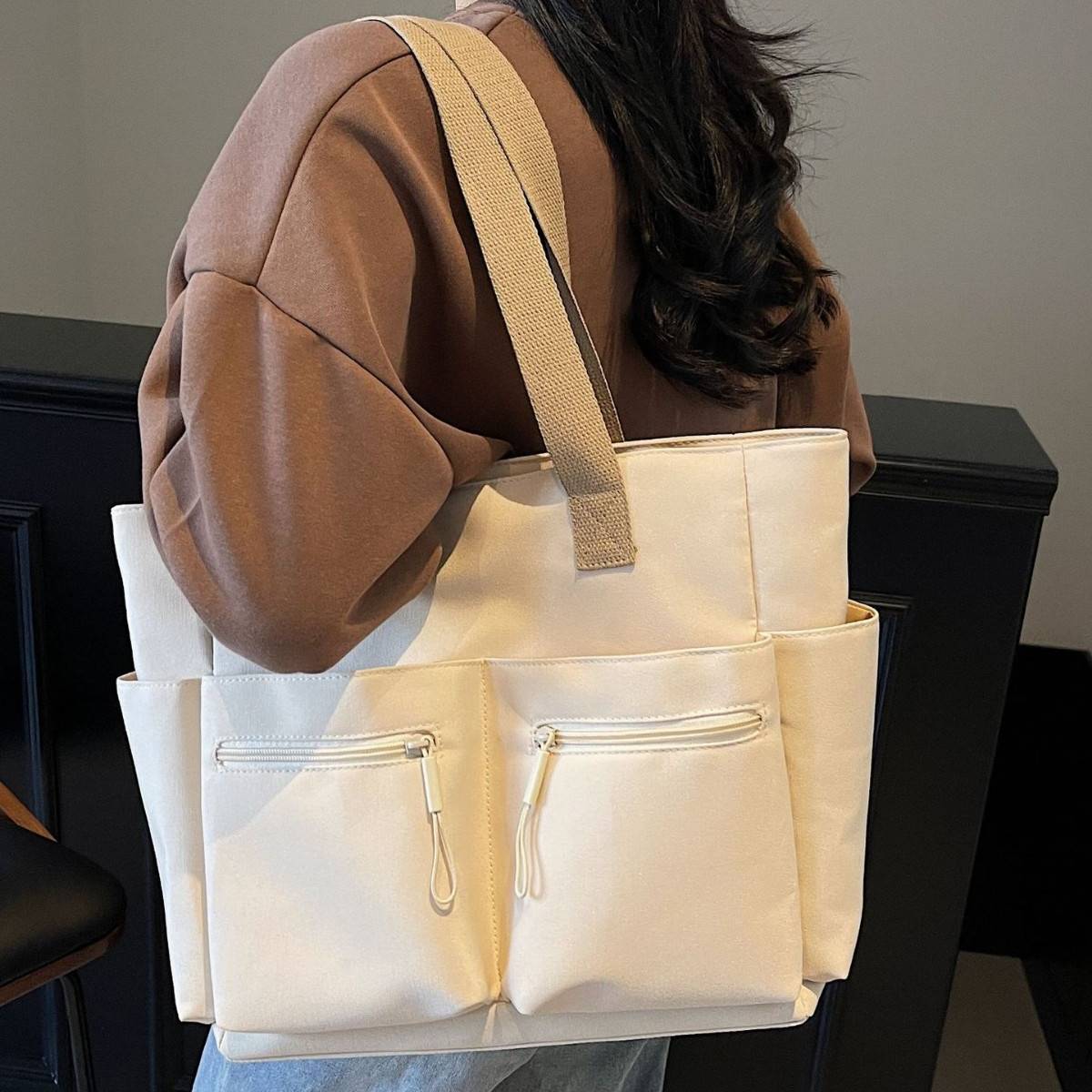 シンプルで実用性抜群のキャンバストートバッグが登場。洗練されたデザインに加え、前面にはジッパーポケットが2つ、サイドにはドリンクや小物がすぐに取り出せるポケット付き。A4ファイルやノートパソコン、タンブラー、コスメなどをしっかり収納できる大容量設計で、通学・通勤・マザーズバッグとしても大活躍します。
