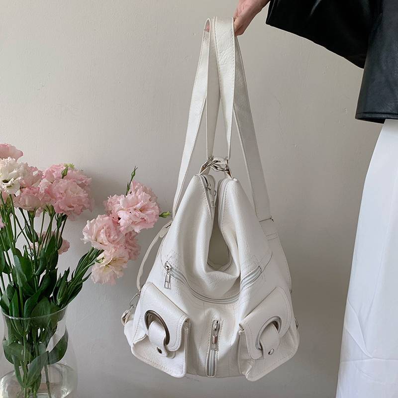 バッグの形はくたっと感のあるソフトなフォルムで、A4サイズもすっぽり収納できる大容量。通勤・通学・お出かけ・旅行など、さまざまなシーンで活躍します。荷物が多い日も、しっかり収納できる安心の収納力が魅力です。トレンドのY2Kや韓国ファッションにぴったりなデザインで、スタイルのアクセントにもなります。