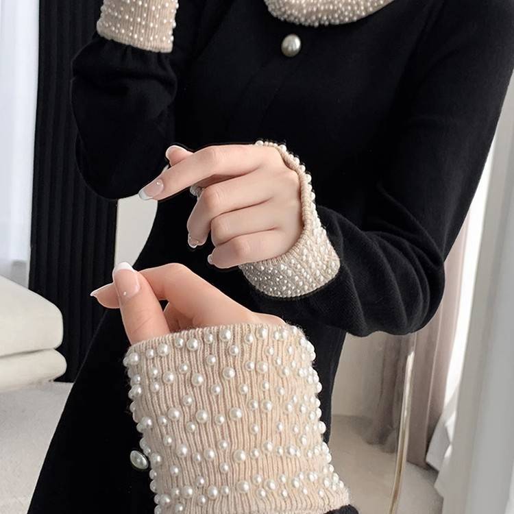 上品な印象を与えるブラックのロングワンピース。襟元と袖口にあしらわれたパール風の装飾が華やかさをプラスし、フォーマルなシーンから日常のちょっとしたお出かけまで幅広く着こなせます。シンプルながらも女性らしいシルエットを引き立てるデザインです。