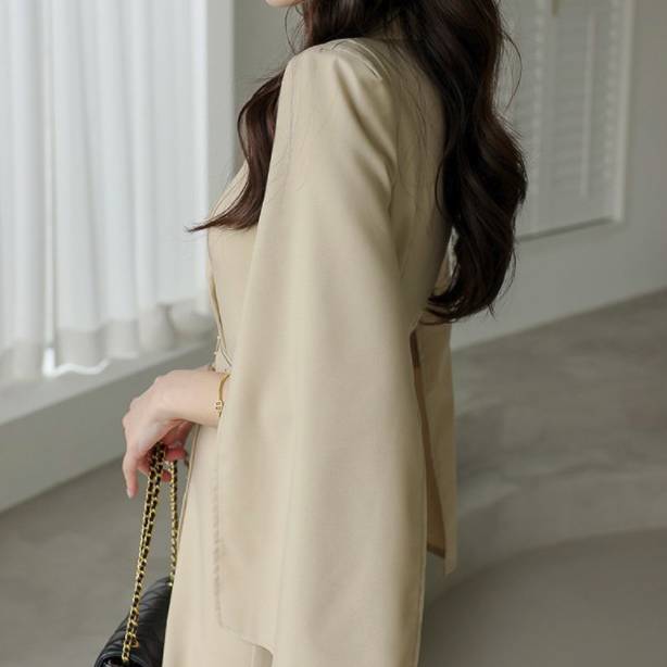 二重ボタンと細ベルトでウエストを引き締め、スタイルアップを叶えます。肩から流れるケープスリーブが動くたびにエレガントに揺れ、女性らしい魅力を最大限に引き立てる一着。