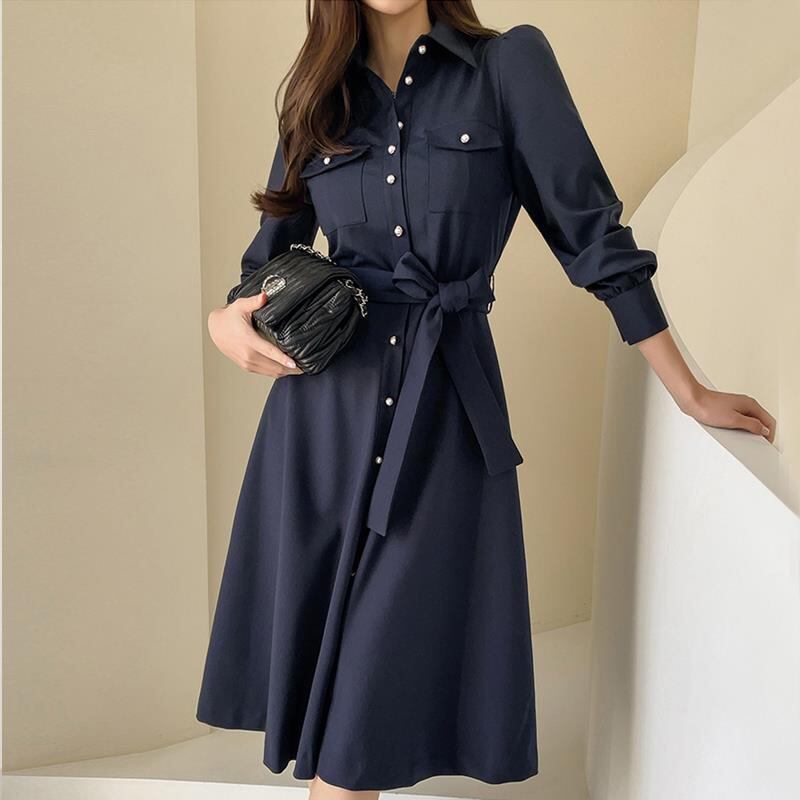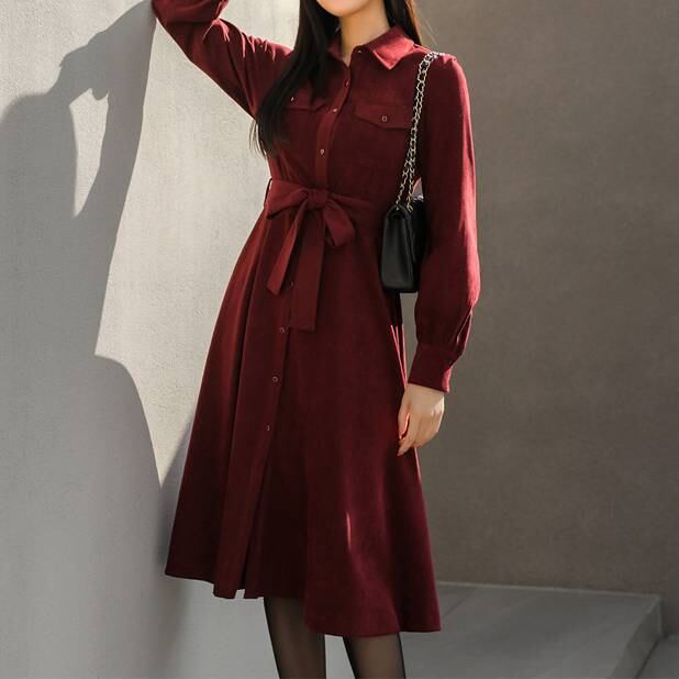 ベルト付き シャツワンピース ミディ丈 長袖 レディース きれいめ 上品 シンプル 無地 フレアワンピース 大人可愛い 韓国風 オフィス 通勤 通学 デート 秋冬 春 着痩せ 美シルエット ベルトリボン ウエストマーク エレガント フォーマル カジュアル ネイビー ボルドー おしゃれ 人気 20代 30代 40代 女性向け ファッション C-OSS0133