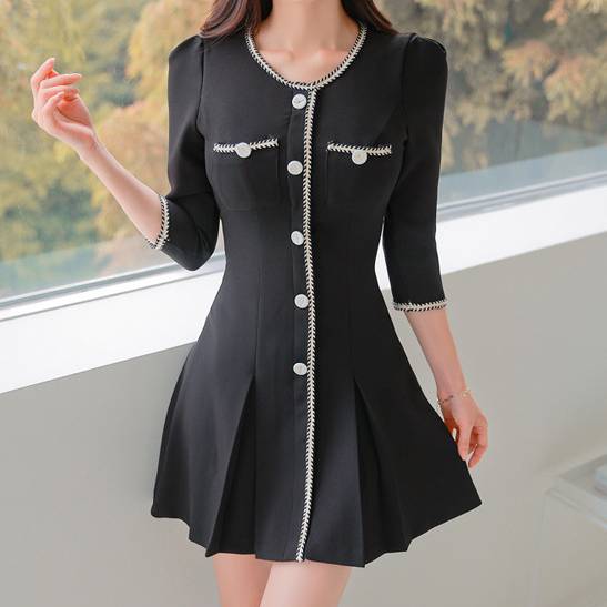 ブラック ワンピース レディース ミニドレス ツイード風 トリムデザイン フレアスカート フロントボタン 長袖風 七分袖 春 夏 秋 冬 韓国風 きれいめ 上品 フォーマル お呼ばれ デート 通勤 オフィス OL 20代 30代 40代 着痩せ 高見え エレガント シンプル 大人フェミニン 人気 C-OSS0146