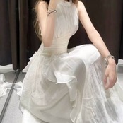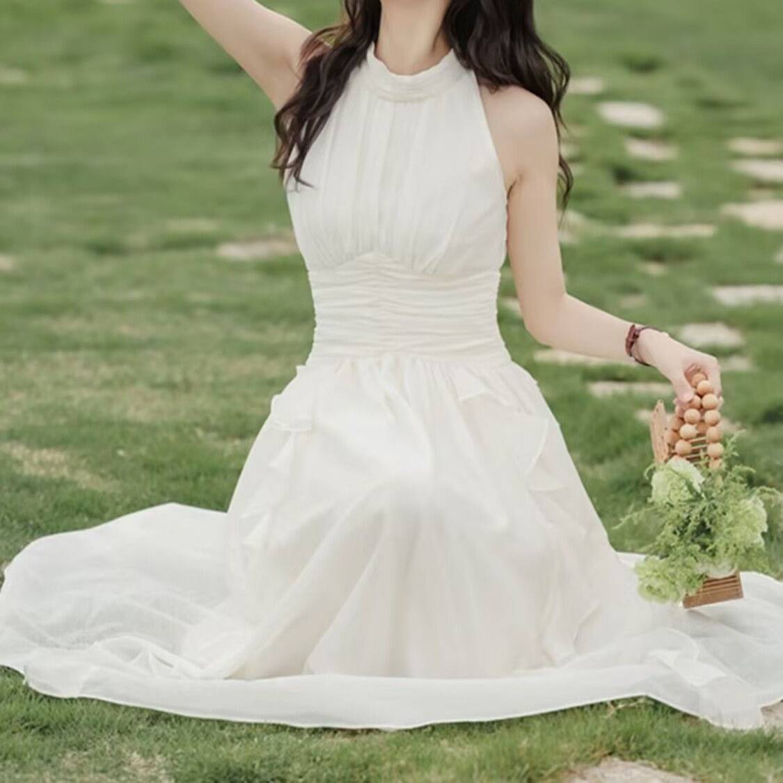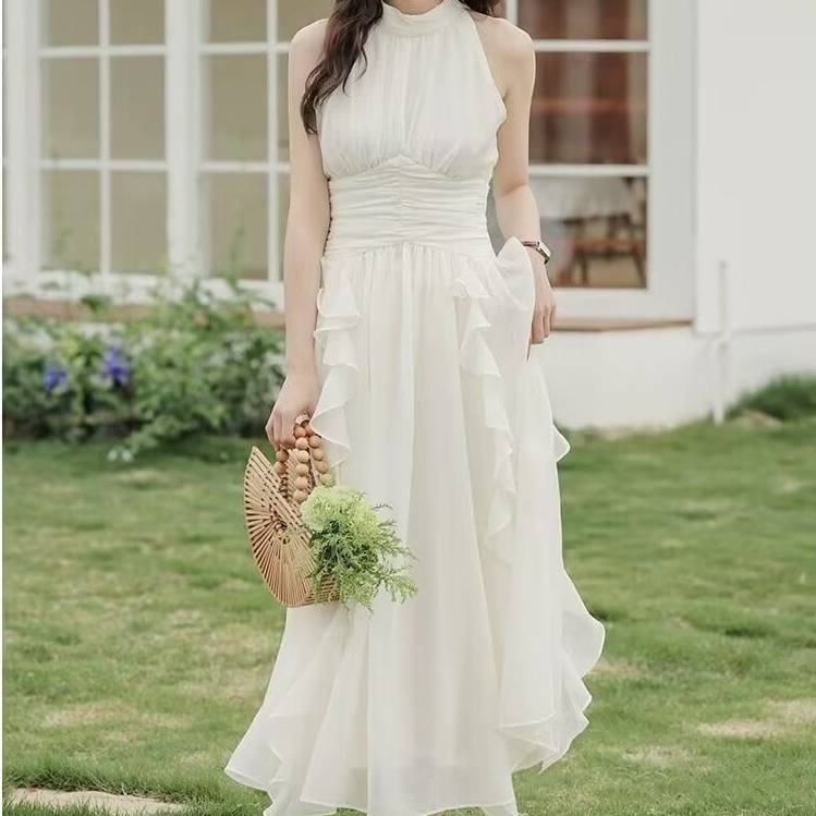 ロングワンピース レディース シフォン フリル ハイネック ノースリーブ フレア Aライン エレガント 清楚 上品 韓国風 きれいめ 美ライン ウエストマーク 春 夏 秋 冬 お呼ばれ デート 食事会 フォーマル リゾート パーティー 人気 大人可愛い ホワイト C-OSS0158