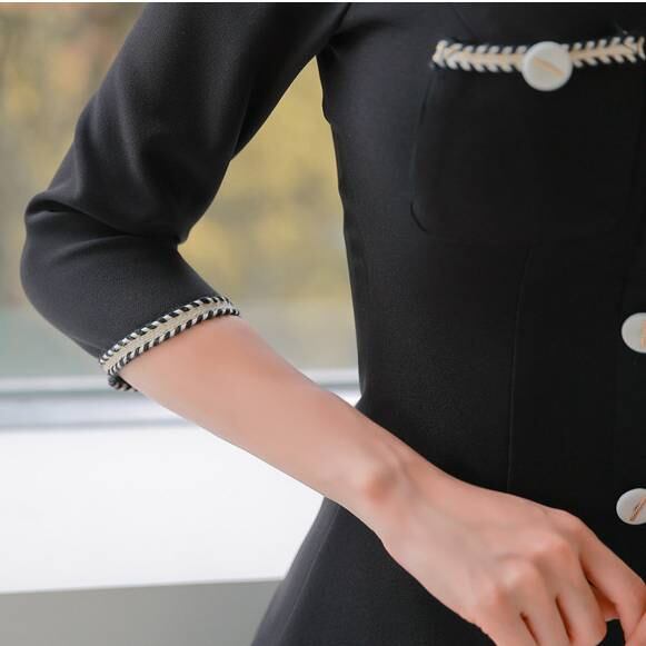 ブラック ワンピース レディース ミニドレス ツイード風 トリムデザイン フレアスカート フロントボタン 長袖風 七分袖 春 夏 秋 冬 韓国風 きれいめ 上品 フォーマル お呼ばれ デート 通勤 オフィス OL 20代 30代 40代 着痩せ 高見え エレガント シンプル 大人フェミニン 人気 C-OSS0146