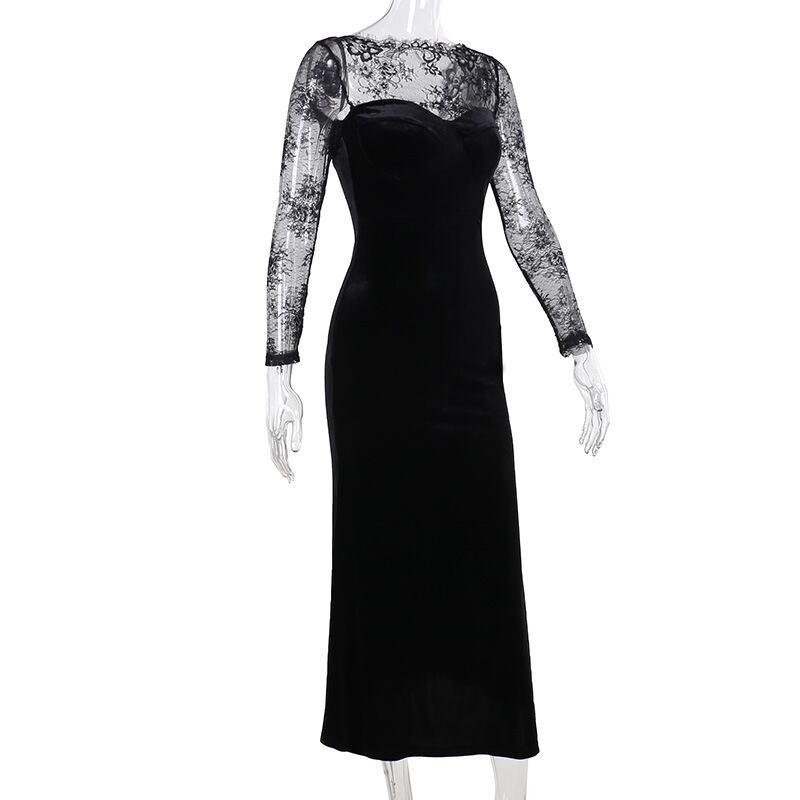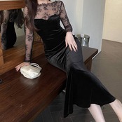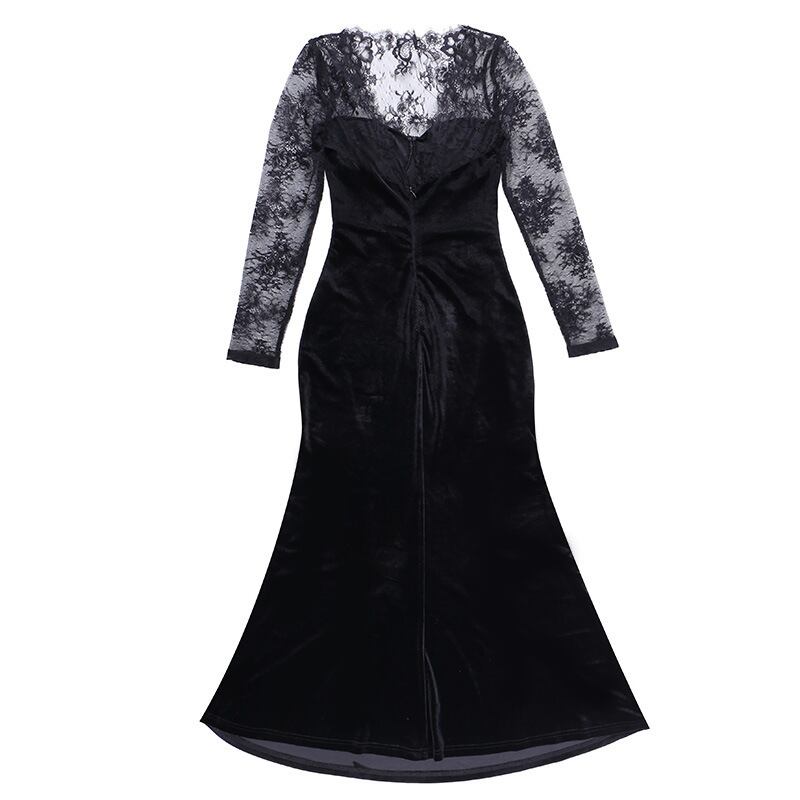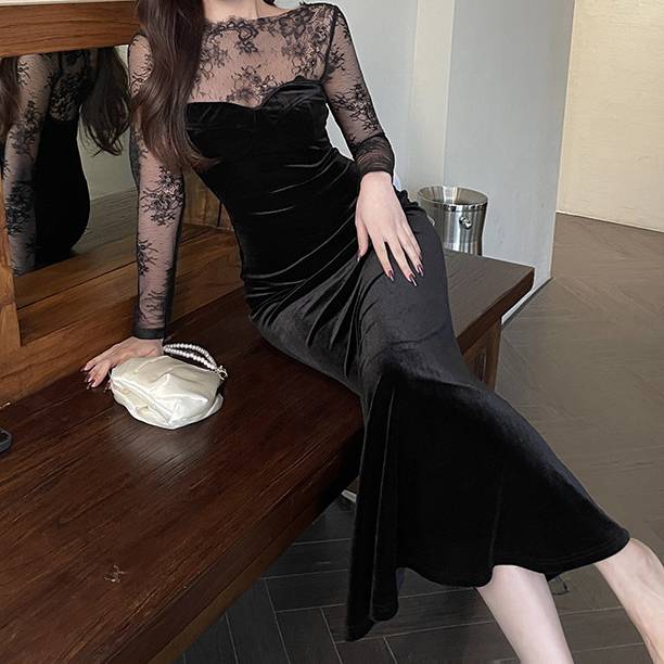 ベロア ロングドレス 黒 レース スリーブ シースルー レディース 上品 高級感 エレガント フォーマル マーメイドライン タイトドレス 韓国風 ワンピース 結婚式 二次会 披露宴 デート 20代 30代 40代 秋 冬 春 パーティー 発表会 お呼ばれ シースルー 長袖 美シルエット 着痩せ 高見え ブラック C-OSS0140