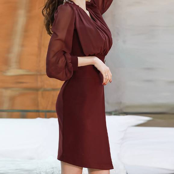 シフォン切替 ワンピース タイト ドレス レディース 長袖 上品 きれいめ Vネック パーティードレス エレガント フォーマル 韓国風 フィット シースルー袖 春 夏 秋 冬 二次会 結婚式 お呼ばれ デート 体型カバー 大人フェミニン 高見え おしゃれ 20代 30代 40代 通勤 OL レッド ワインレッド トレンド 人気 C-OSS0138