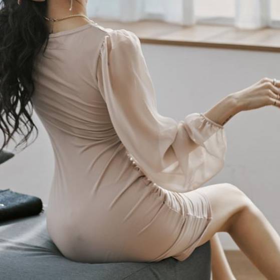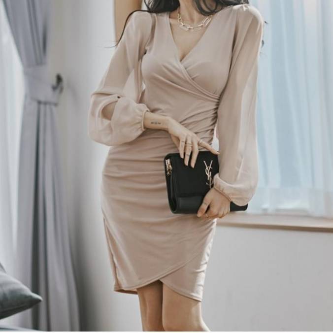 シフォン スリーブ ワンピース タイト ドレープデザイン Vネック レディース 長袖 エレガント 韓国風 上品 お呼ばれ きれいめ 春 夏 秋 冬 体型カバー デート 通勤 二次会 フォーマル おしゃれ 大人フェミニン 20代 30代 40代 高見え カーキ ベージュ風カラー パーティードレス トレンド 人気 C-OSS0137