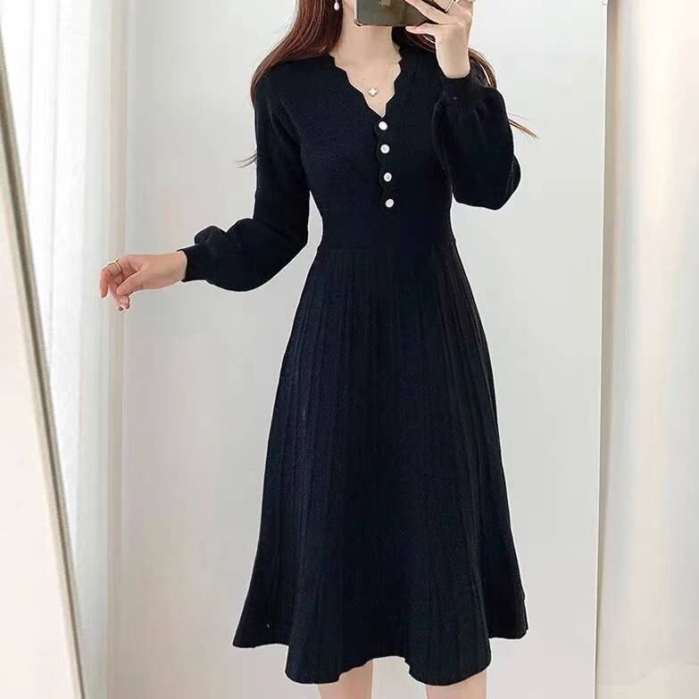 レディース ニットワンピース ロング丈 パールボタン Vネック Aライン 長袖 上品 エレガント きれいめ シンプル 通勤 デート 秋冬 春 カジュアル 可愛い 韓国風 着痩せ 体型カバー ブラック ベージュ カーキ 3色展開 フレアスカート C-OSS0166