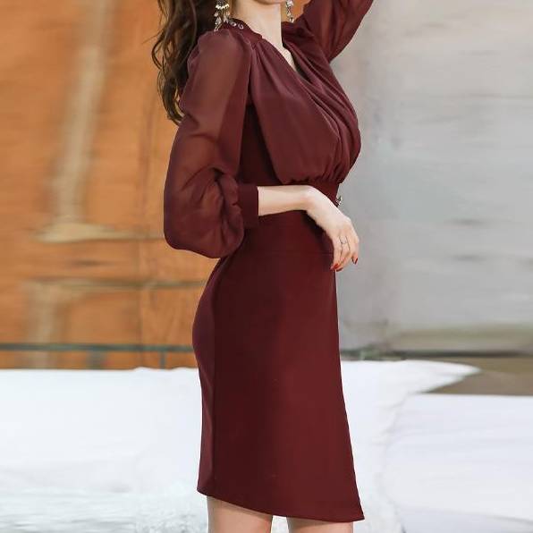 レッド ワンピース レディース 長袖 シフォン タイトワンピース ドレス きれいめ 上品 大人エレガント パーティードレス 通勤 フォーマル 秋 冬 春 着痩せ 美シルエット 韓国ファッション 高級感 お呼ばれ 二次会 デート 人気 トレンドファッション C-OSS0198