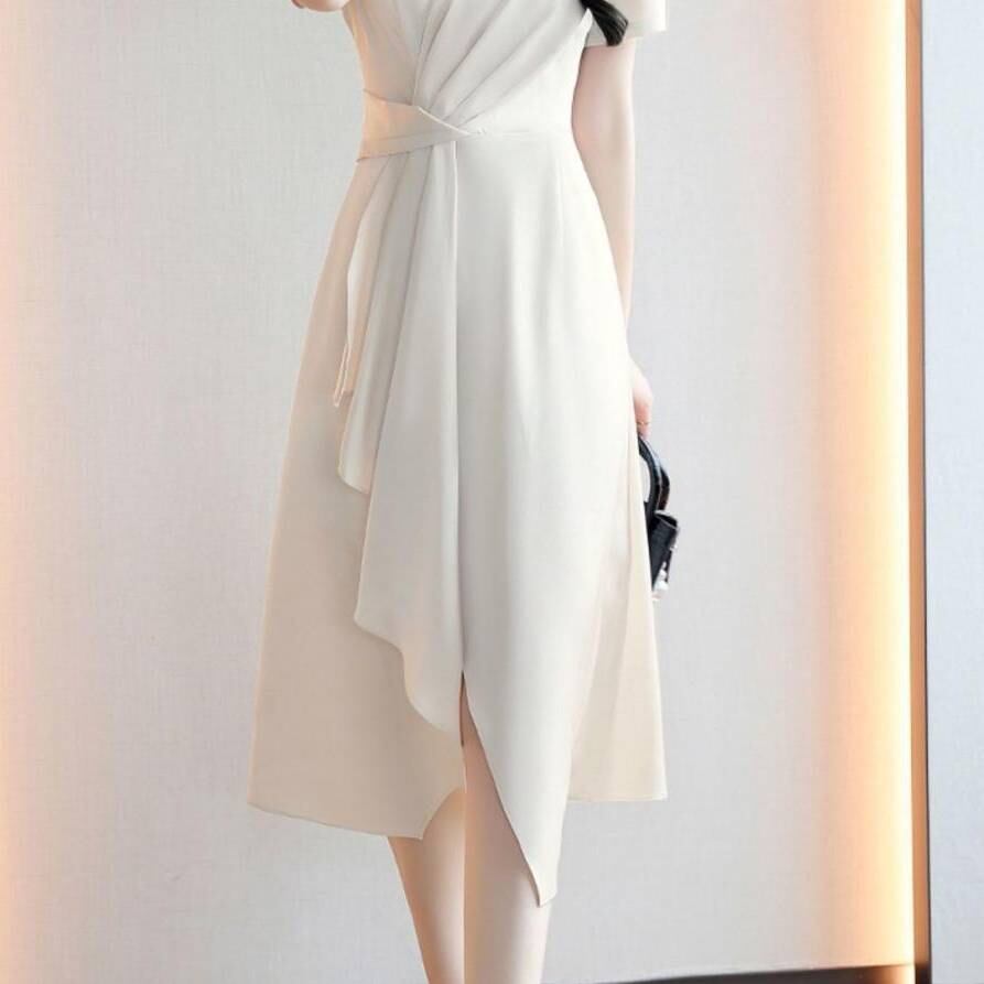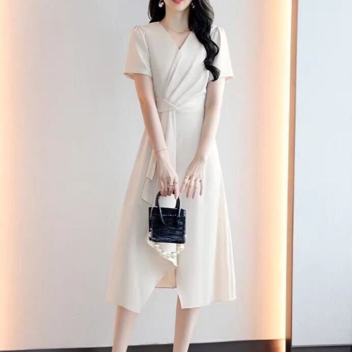 商品名:Vネック ワンピース レディース 上品 ミディ丈 ドレープデザイン フレアワンピース