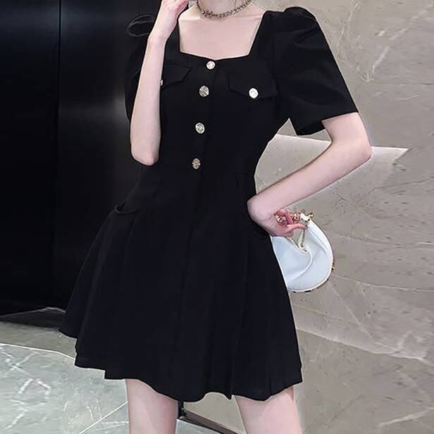 上品なスクエアネックと華奢見えシルエットが魅力の、女性らしさを引き立てるミニワンピース。ふんわりとしたパフスリーブと高級感のあるボタンデザインが、クラシカルで大人可愛い印象を演出します。デート・女子会・特別な外出にもぴったりな、着るだけでスタイルアップが叶う一枚です。