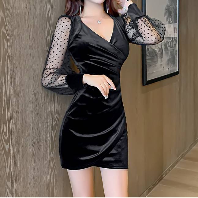 ブラック レッド ワンピース レディース ベルベット ワンピース ミニ丈 タイトワンピース 長袖 ドットチュール シアースリーブ Vネック 上品 エレガント セクシー 高見え 韓国ファッション パーティー 二次会 デート 冬 春 秋 夏 トレンド 大人可愛い 人気 C-OSS0216