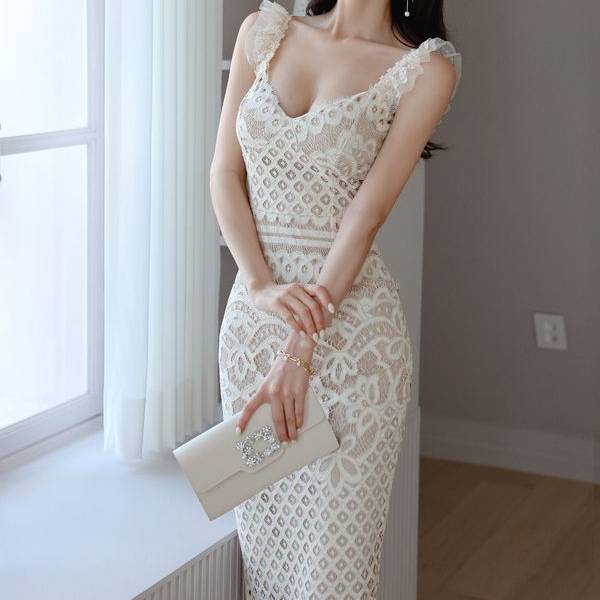 ホワイト ワンピース レディース レースワンピース ノースリーブ タイト ミディ丈 フェミニン エレガント 上品 高級感 パーティー 二次会 デート お呼ばれ 結婚式 清楚 美ライン 体型カバー 大人可愛い 韓国ファッション 春 夏 秋 トレンド 人気 ドレススタイル C-OSS0207