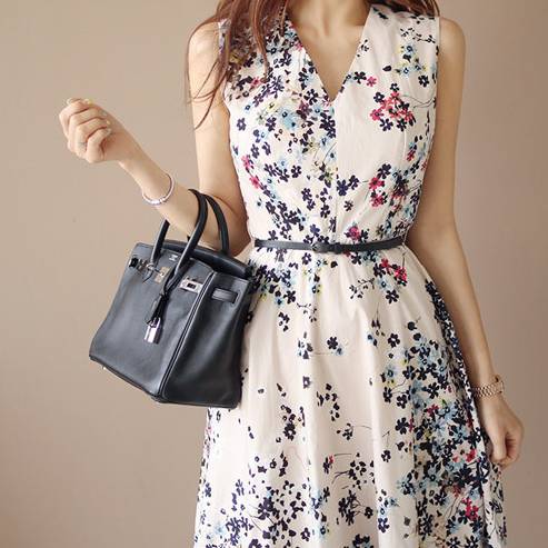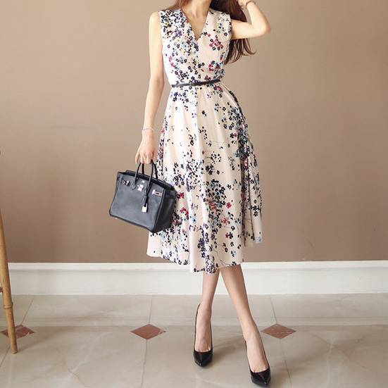 華やかな花柄が印象的なベージュのノースリーブワンピース。