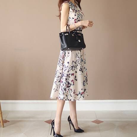 ベージュ ワンピース レディース 花柄 ノースリーブ ミモレ丈ワンピース フラワープリント エレガント 上品 きれいめ 大人可愛い 韓国ファッション 春 夏 秋 オールシーズン 着回し おしゃれ 通勤 デート お呼ばれ 二次会 カジュアル 人気 トレンド フェミニン C-OSS0196