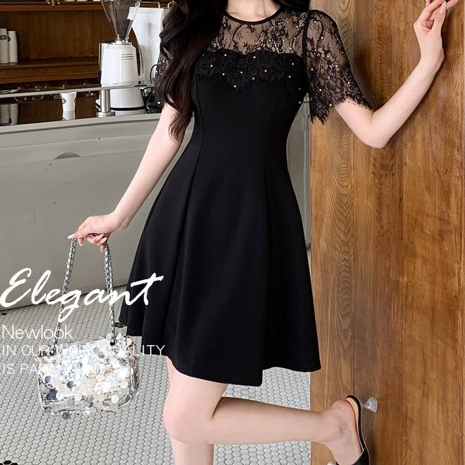 ブラック ワンピース レディース レース切り替え フレアワンピース ミニドレス 半袖 透け感 上品 きれいめ 大人可愛い エレガント 韓国ファッション デート お呼ばれ 二次会 パーティー 春 夏 秋 冬 オールシーズン 着回し フォーマル カジュアル おしゃれ 人気 トレンド C-OSS0195
