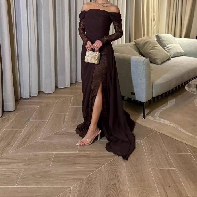 ダークブラウン オフショルダー ロングドレス レーススリット ドレス レディース パーティードレス 大人 上品 きれいめ セクシー 結婚式 二次会 お呼ばれ 韓国風 ロング丈 スリットドレス 高級感 エレガント スタイルアップ 美シルエット C-OSS0236
