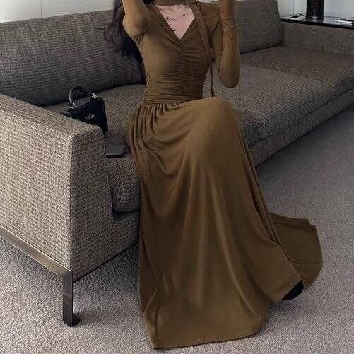 しなやかに広がるロングシルエットが女性らしさを引き立てる、上品でエレガントなロングワンピースです。胸元のギャザーが立体感をつくり、縦ラインを強調して美しいボディラインを演出。歩くたびにゆれる裾が魅力的で、シンプルながらも大人の存在感を漂わせます。