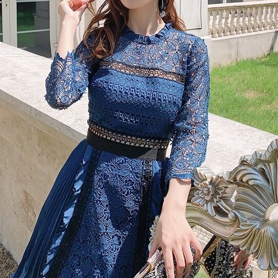 レース&プリーツのミディアムワンピース。