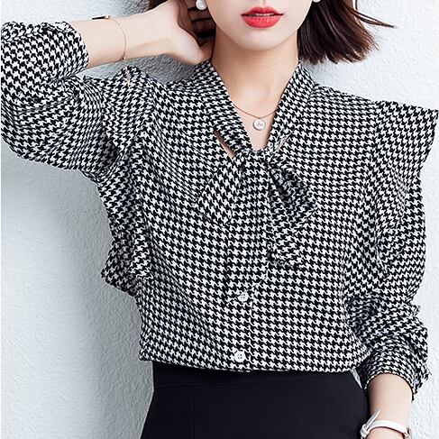 千鳥柄シャツ レディース 春夏 秋冬 春 夏 秋 冬 白 黒 ブラウス トップス 長袖 フリル 長袖トップス 千鳥柄シャツ トップス チュニック フリルブラウス 千鳥柄 ホワイト ブラック 千鳥柄ブラウス 韓国 ゆったり ボウタイシャツ ブラウスシャツ 体型カバー シンプル シャツブラウス オフィス カジュアル OL 上品 大人 10代 20代 30代 40代 C-TSS0054
