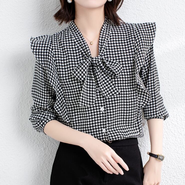 商品名:千鳥柄 フリル ボウタイ ブラウスシャツ