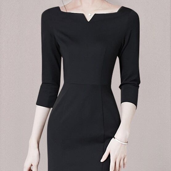 商品名:変形スクエアネク 七分袖 マーメイド ミモレ丈ワンピース ドレス