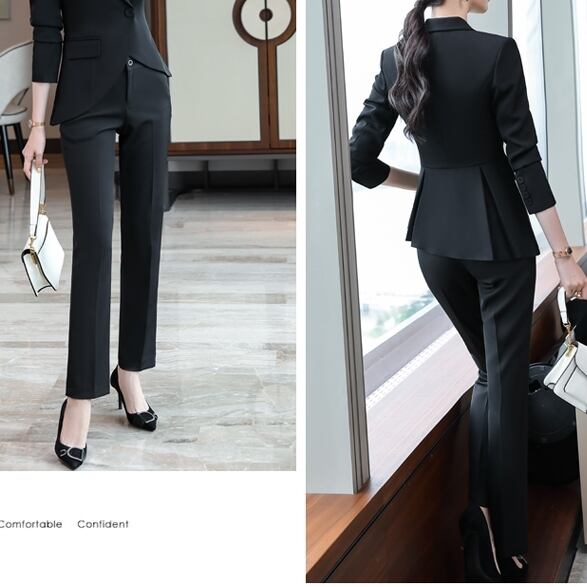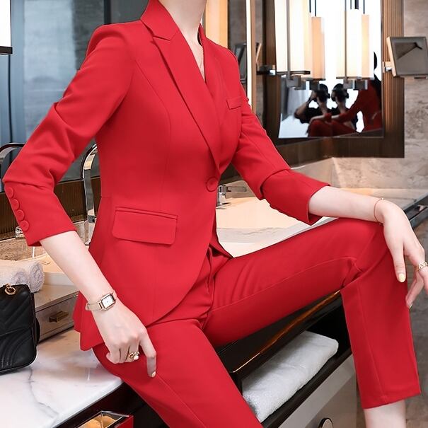 ジャケットとパンツのパンツスーツ。