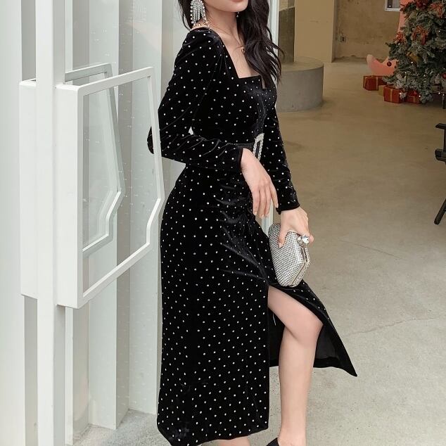 商品名:ドット柄パフスリーブ&スクエアネック ロングワンピース