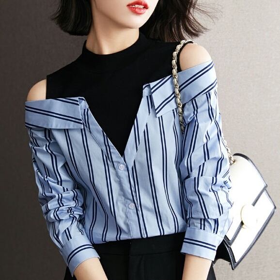 シャツ レディース 春夏 秋冬 春 夏 秋 冬 ブラウス シャツ トップス 長袖 レイヤード 長袖トップス チュニック カットショルダー オフショルダー ハイネック ストライプシャツ 水色 ライトブルー 韓国 ゆったり ノースリーブ シャツブラウス オフィス カジュアル OL 上品 大人 10代 20代 30代 40代 C-TSS0045