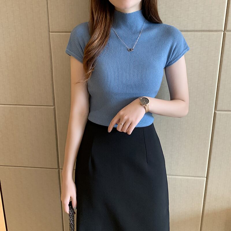 トップス レディース ニット 半袖 フレンチスリーブ 半袖ニット ハイネック リブニット 春 夏 春夏 サマーニット ホワイト ライトパープル ベージュ グレー テラコッタ ピンク アイボリー ライトブルー ブラック セーター C-TSS0007
