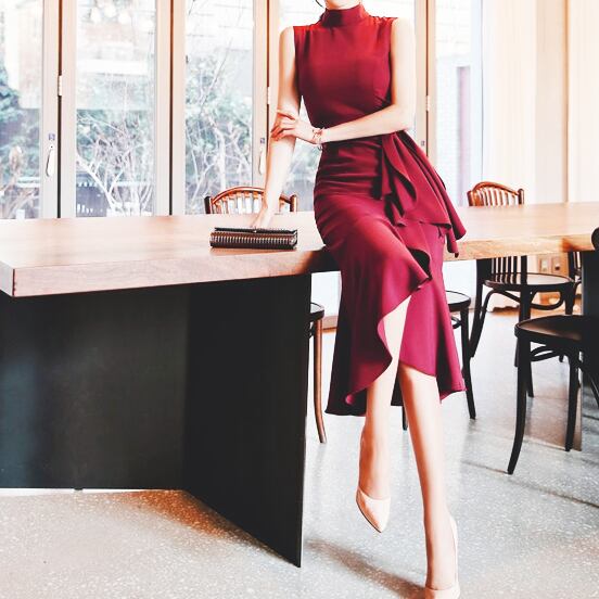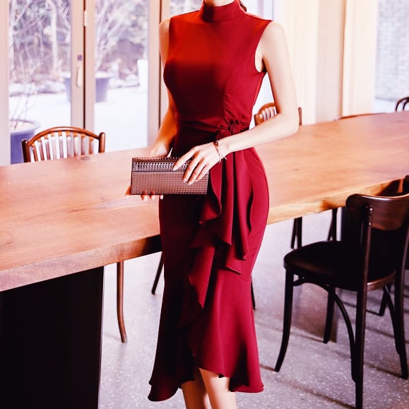商品名:ハイネック ノースリーブ ラッフルフリル マーメイドワンピースドレス