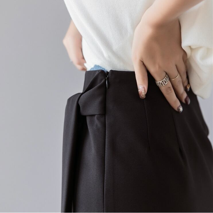 ウエストのリボンで少し甘さをプラスして。
