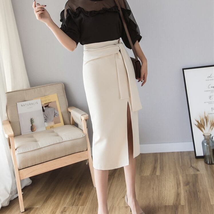 スカート タイトスカート ウエストリボン スリット入り ミモレスカート ミディアム スリット ひざ下 ひざ丈 ブラック アイボリー 黒 C-SAW0013
