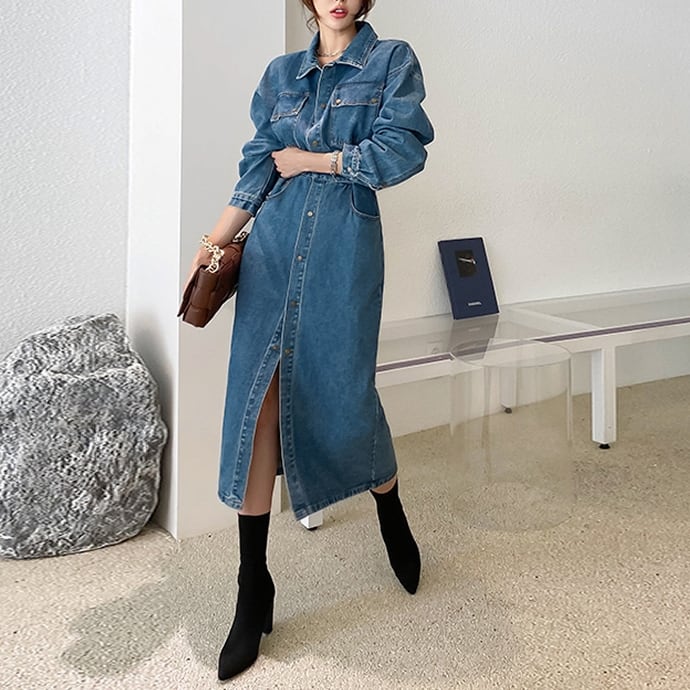 ロング丈のデニムワンピース。