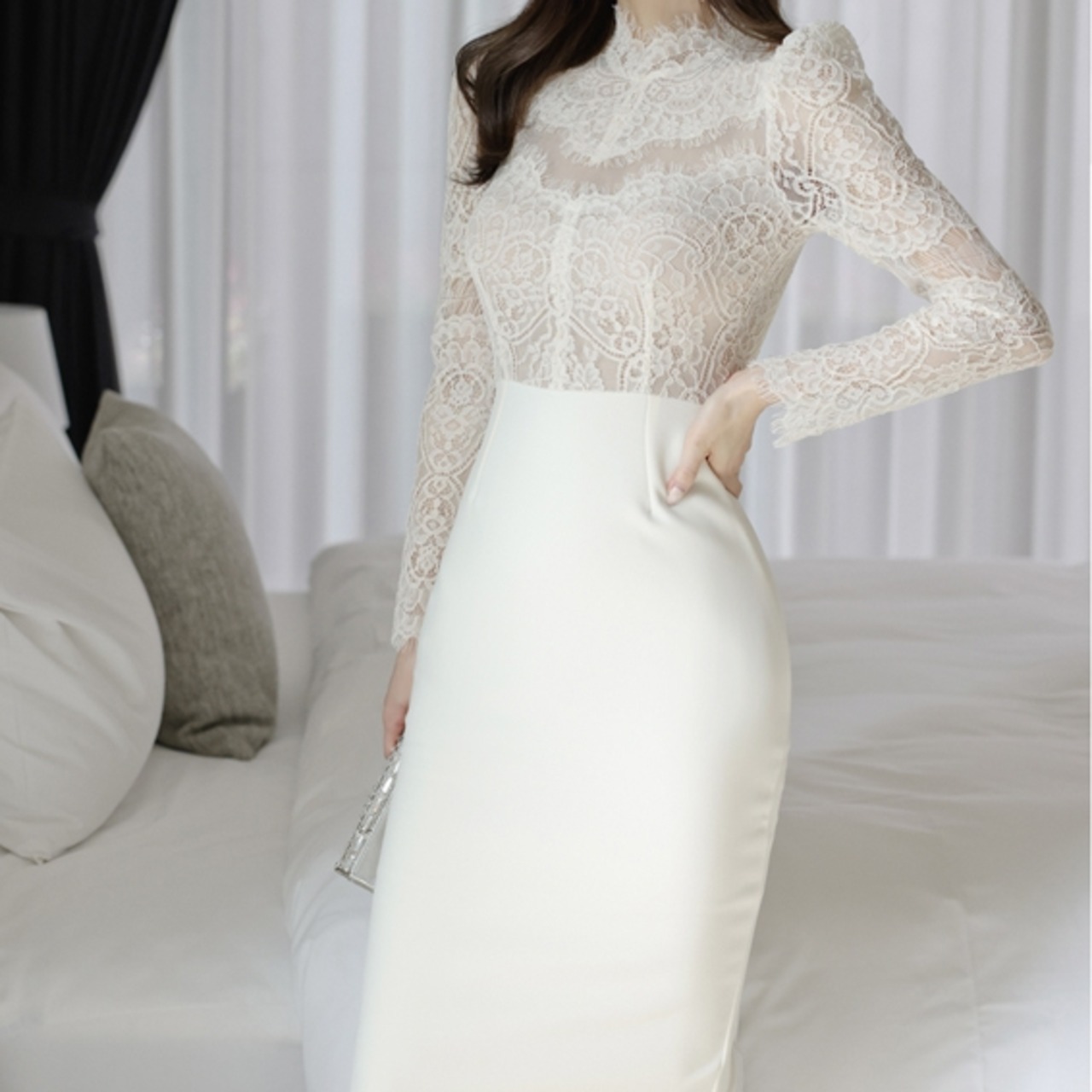 シースルー レース 長袖 ミディアム タイトドレス C-DSS1007