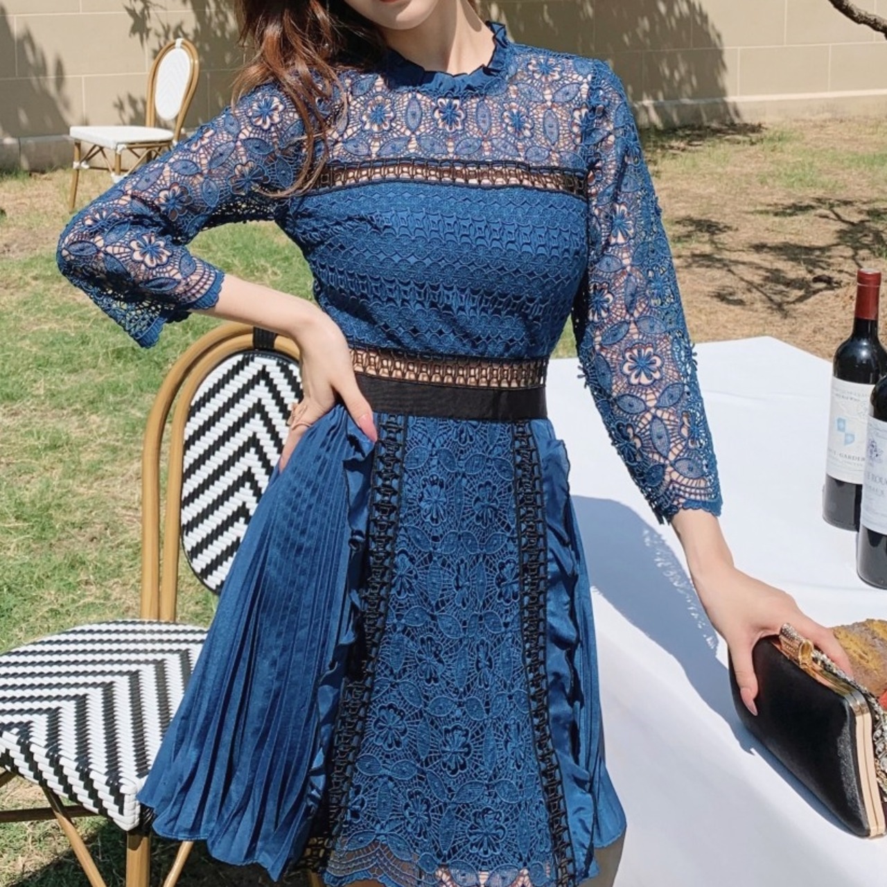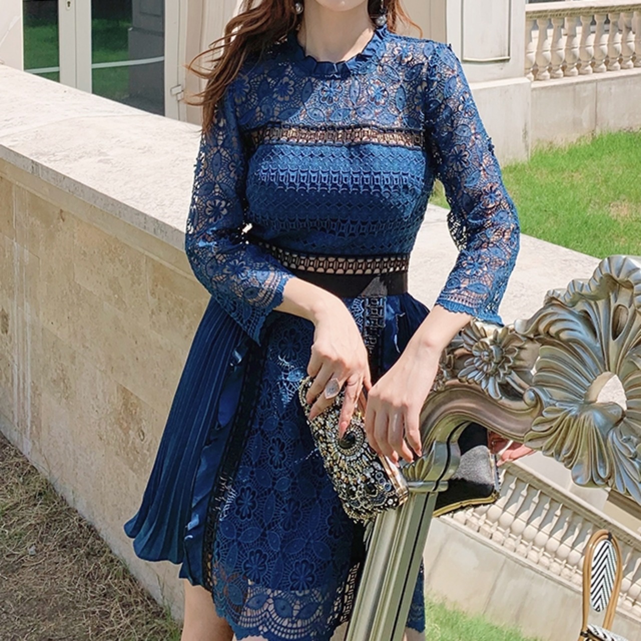 商品名:レース7分袖 プリーツ Aラインドレスワンピース