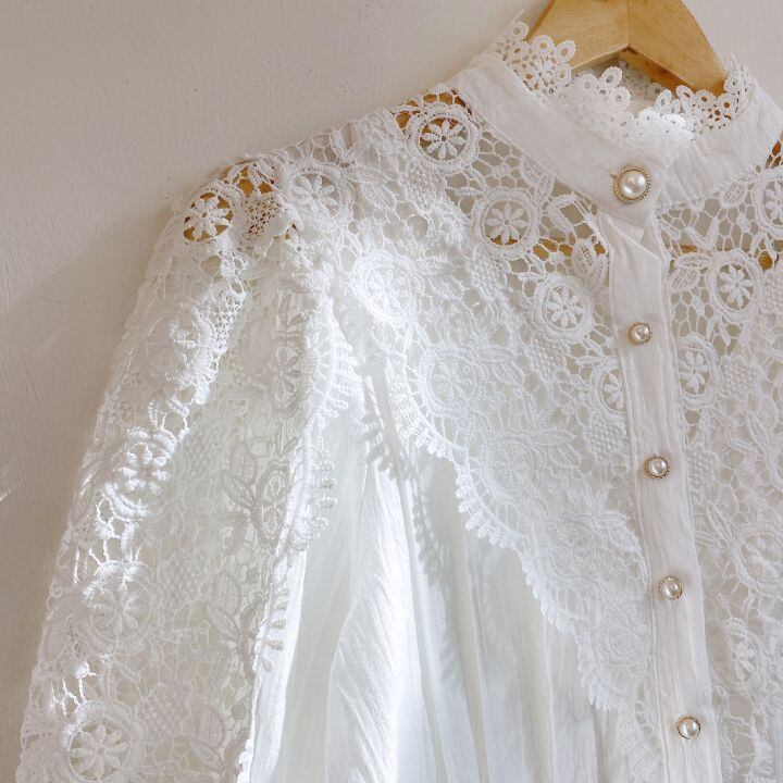 胸元だけではなく首や袖の細部にまでレースを使い、