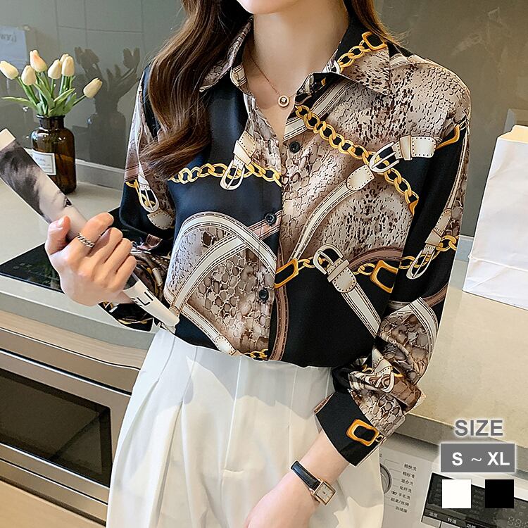 ブラウス レディース 春夏 秋冬 春 夏 秋 冬 白 サテン地 シャツ トップス チェーン柄 ベルトデザイン プリント 柄ブラウス 長袖 トップス チュニック ベルト ボウタイシャツ きれいめ 柄シャツ アイボリー ブラック オフィスカジュアル スーツ ブラウス 韓国 ゆったり ブラウスシャツ シンプル 長袖シャツ ブラウスシャツ シャツブラウス オフィス カジュアル OL 上品 大人 S M L XL 2XL 20代 30代 40代 50代 C-TSS0066